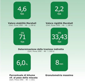 Stabilità Marshall pari a 4,6 Kpa e trazione indiretta ITS 71 Kpa.